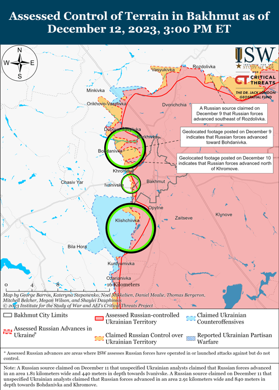 В Інституті вивчення війни (ISW) зазначають, що українські війська станом на сьогодні, 13 грудня, продовжують наступальні операції на північний схід і південь від Бахмута.