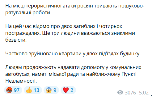 За його словами, дещо пошкоджені квартири у двох підʼїздах будинку. Наразі продовжуються пошуково-рятувальні роботи.