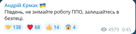 Оновлено 00:49. Очільник Офісу Президента Андрій Єрмак закликав не знімати роботу українських захисників на Півдні країни та залишатись у безпеці.