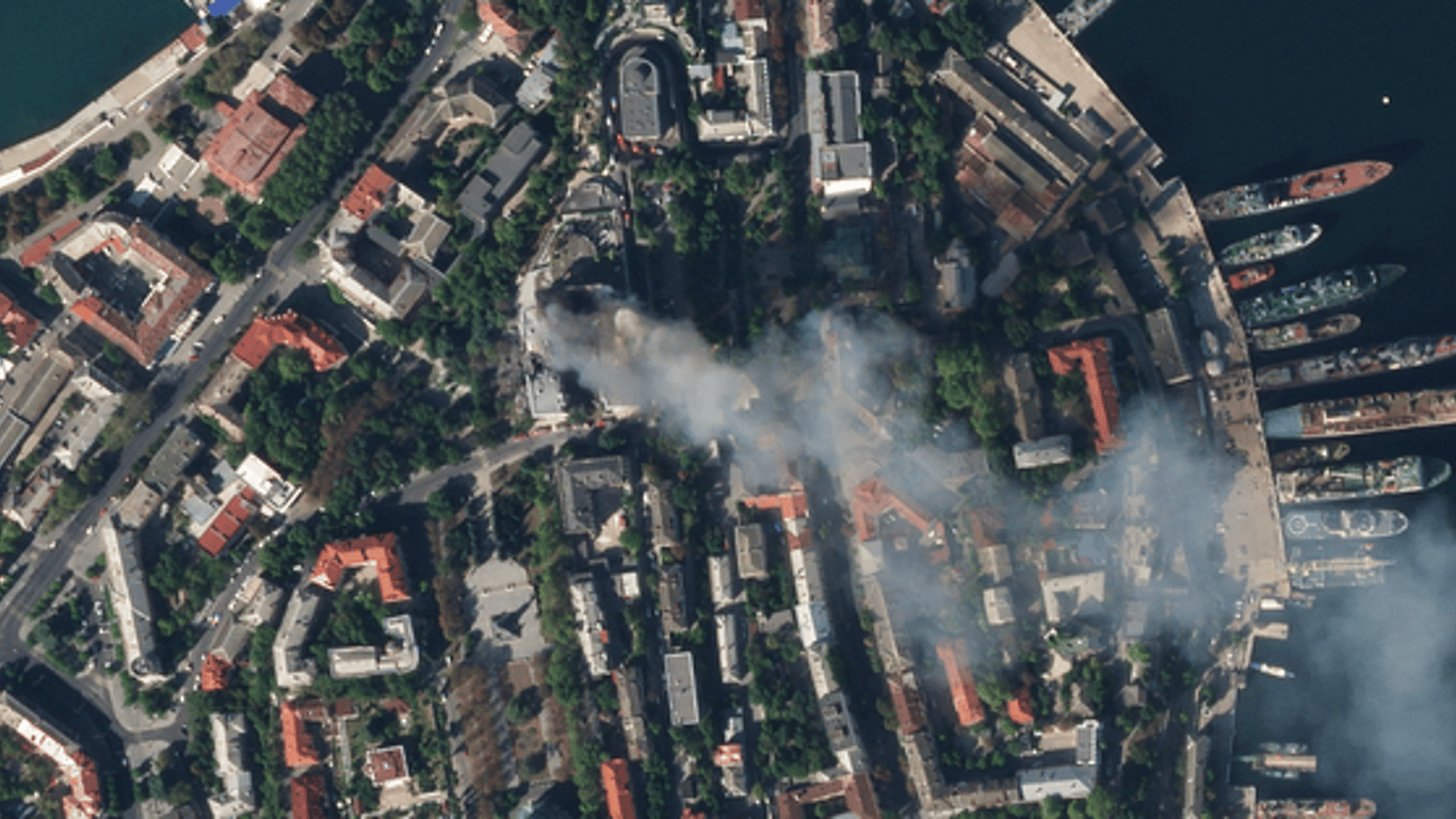 Компания Planet Labs сделала спутниковые снимки, где можно увидеть, как выглядит штаб Черноморского флота РФ в Севастополе до и после ракетной атаки. Случилось это вчера, 22 сентября.