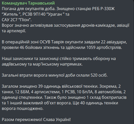 Тарнавский рассказал, что только на Таврическом направлении за последние сутки Силы обороны уничтожили 520 оккупантов и 39 единиц их военной техники. Среди их потерь — станция РЭБ Р-330Ж "Житель", РСЗО 9П140 "Ураган" и САУ 2С7 "Пион".