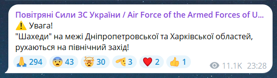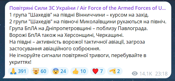 Скриншот сообщения из телеграмм-канала "Воздушные силы ВС Украины"