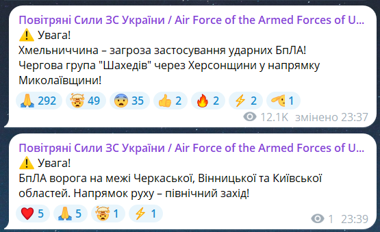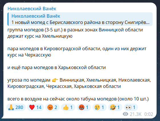 Обновлено 23:39. Военные сообщают об угрозе для Хмельницкой области и движении очередных "шахедов" из Херсонской области в сторону Николаевской.