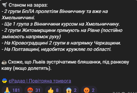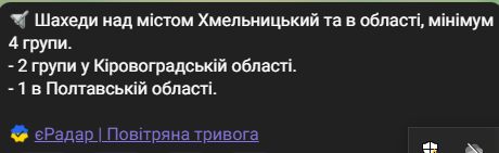 "Кропивницкий, Миргород, Хмельницкий, Староконстантинов — атака "Шахедов" продолжается! Работает ПВО! Оставайтесь в укрытиях!", — написали Воздушные Силы Украины.