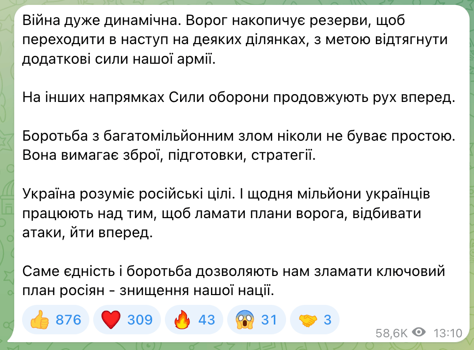 "Именно единство и борьба позволяют нам сломать ключевой план россиян — уничтожение нашей нации", — написал политик.