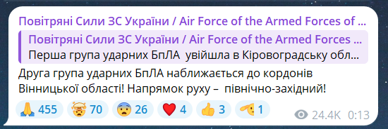 Скриншот сообщения из телеграмм-канала "Воздушные силы ВС Украины"