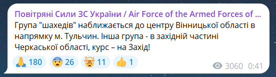 Обновлено 00:42."Группа "шахедов" приближается к центру Винницкой области в направлении г. Тульчин. Другая группа — в западной части Черкасской области, курс — на Запад!" — предупреждают военные.