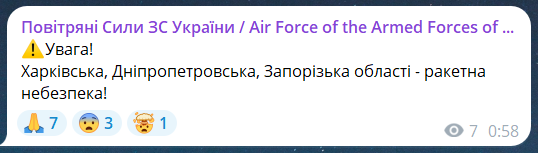 Воздушные силы сообщают о ракетной опасности в Харьковской, Днепропетровской и Запорожской областях.