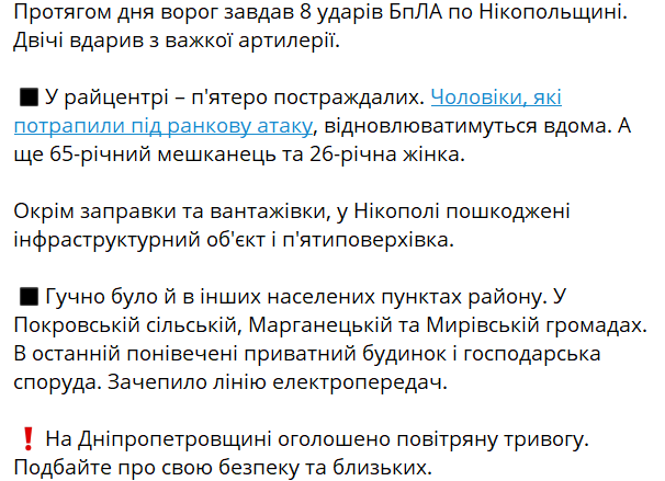 По данным ОВА, в Никополе пострадали пять человек. В частности, мужчины, попавшие под утреннюю атаку, будут восстанавливаться дома.