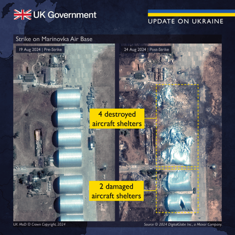 Кроме того, была разрушена радиолокационная станция, вспомогательные постройки и открытые складские площади. Британская разведка обнародовала спутниковые снимки с мест поражения до и после атаки.
