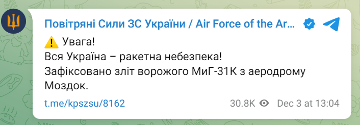 "Внимание! Вся Украина — ракетная опасность! Зафиксирован взлет вражеского МиГ-31К с аэродрома Моздок", — отметили в сообщении.