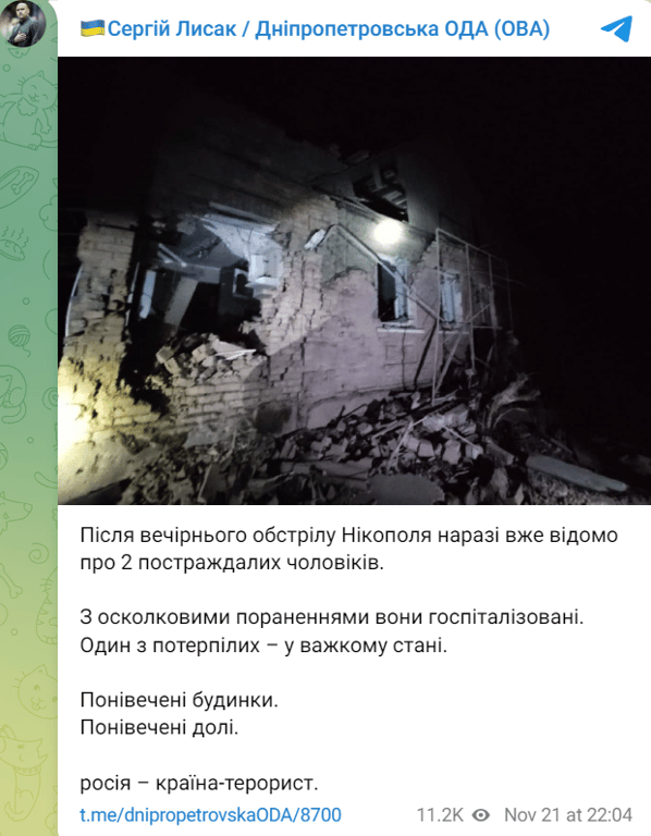 Враг продолжает обстреливать населенные пункты Днепропетровской области. Сегодня, 21 ноября, под огонь оккупантов попал город Никополь. Уже известно о двух пострадавших.