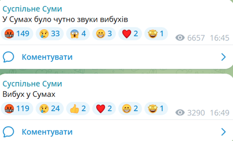 Перші вибухи в Сумах пролунали о 16:45. Після цього було чутно звук ще одного удару. Інформація уточнюється.