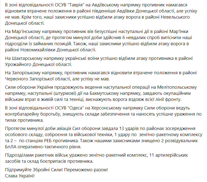 Протягом минулої доби авіація Сил оборони завдала 13 ударів по районах зосередження особового складу, озброєння та військової техніки, один удар по зенітно-ракетному комплексу та два — по станціях РЕБ противника. Також наші захисники знищили два розвідувальних БпЛА оперативно-тактичного рівня.