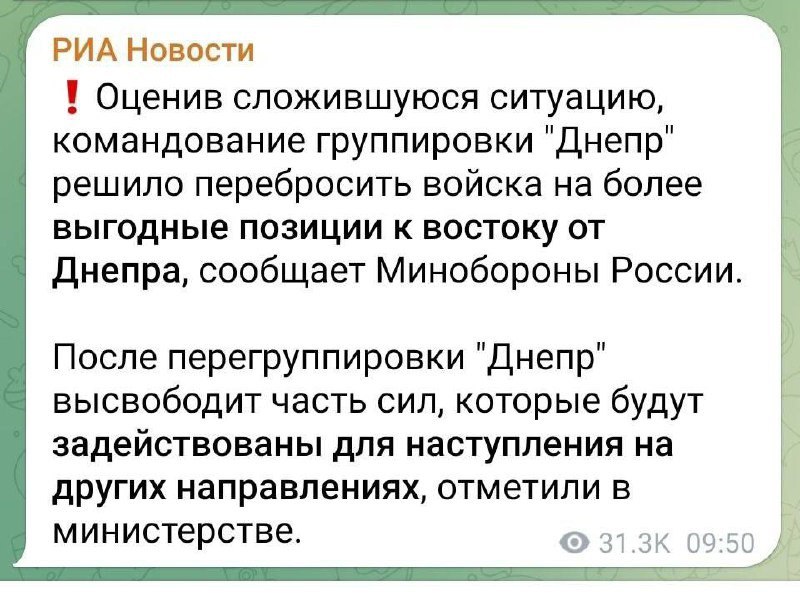 Як відомо, російські держагентства ТАСС і "РИА Новости" повідомили, що Міноборони РФ вирішило перекинути війська "на більш вигідні позиції на схід від Дніпра" у Херсонській області.