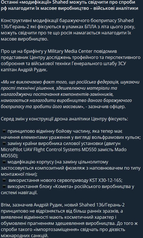 Рудик наголосив, що новий Shahed 136/"Герань-2" принципово не відрізняється від більш ранніх зразків, а відмінності мають косметичний характер і обумовлені прагненням здешевлення виробництва.