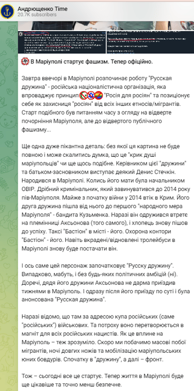 У Маріуполі починає роботу "Русская дружина" — російське націоналістичне угрупування, яке пропагує ідею "Росія для росіян". Організатором групи є маріуполець Денис Стечкін, який на початку війни втік до Криму, а зараз хоче влаштувати у рідному місті етнічні зачистки.